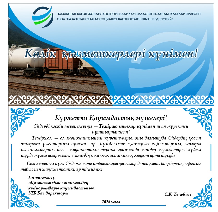 «Қазақстан вагон жөндеу кәсіпорындары қауымдастығы» ЗТБ атынан және жеке өз атымнан Сіздерді және барша жұмысшыларды, депо ардагерлерді «ЖамбылРемСервис» ЖШС құрылғанына 100 жыл толуымен шын жүректен құттықтаймын!